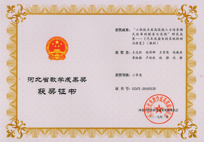 根据河北省教育厅《关于开展第七届河北省高等教育教学成果奖励工作的通知》(冀教高[2016]20号)精神,我院积极申报,经河北省高等教育教学成果专家评审委员会评审,由我院申报的教学项目“工程技术类高技能人才培养模式改革的探索与实践”研究成果——《汽车底盘电控系统检测与修复》(成果完成人:王志欣、赵伟娜、王素英、赵巍岳、李淑敏、卢欣欣、赵静、沈静)荣获三等奖。