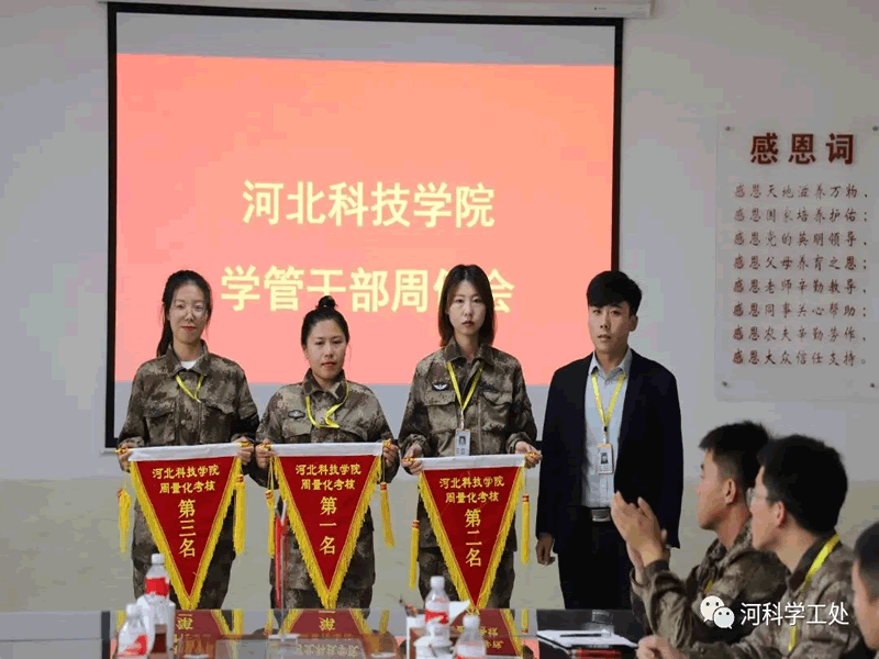 会上,学工处通报了各二级学院各项工作量化考核结果,对两校区行为规范、行进队列、志愿服务、内务卫生、内务卫生免检、量化考核等军校式管理教育先进学生队进行表彰。随后,由吴少帅副校长、倪岩处长等学管领导对两校区量化考核前三名等受表彰的先进队伍进行表彰颁发流动红旗。