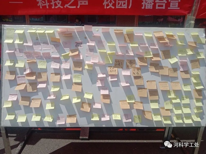 5月4日,科技之声校园广播台在第一食堂门口举办“团团我想和你说”活动,广大青年学生分别在便签上书写对共青团想说的话,依次粘贴在展板上,本次活动得到了我校学生们的积极参与,参与人次达800人,充分展现了我校广大青年学生良好的精神面貌。