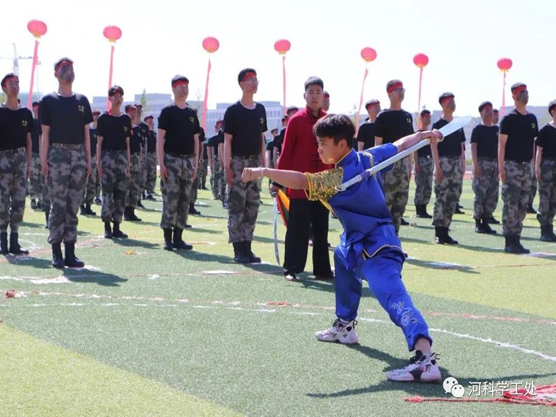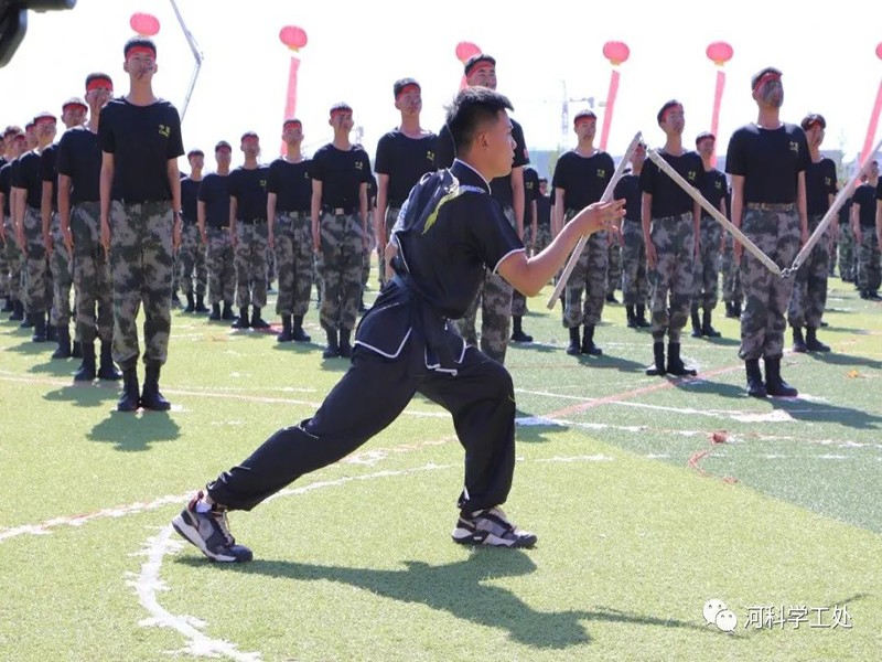 第三个篇章“喜迎二十大 永远跟党走 奋进新征程”由建筑工程学院李佳琪、经济管理学院学院尹天晨、护理与健康学院李润田三位同学带来的舞剑和三节棍表演拉开序幕,他们挥斥刀剑刚劲有力、虎虎生风。建筑工程学院与汽车工程学院共同带来了军体操表演,他们挺拔的身躯,连贯的动作,练就了钢铁一般的毅力,敏捷的身手彰显威武不屈的意志,展现了河科学子对祖国的无限深情与厚爱,用青春献礼二十大;艺术学院团体操方阵手持红色彩球,摆出“五角星、党徽、团徽、中国版图、我爱河科”等图案,展现了最靓丽的中国红,表现了河科学子对国家热爱的情怀,要做有理想的好青年。