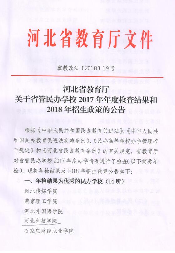 近日,河北省教育厅通报了《河北省教育厅关于省管民办学校2017年年度检查结果和2018年招生政策的公告》(冀教政法19号),我校获评2017年度年检优秀单位。2017年度年检共涉及学校96所,其中评选出优秀单位14所。4月4日,以...