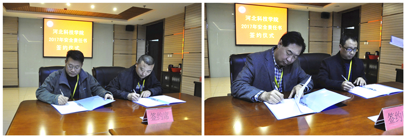 会议最后举行了《2017年安全责任书》签约仪式。根据《河北省安全生产责任之目标管理实施意见》、省综治委《社会治安综合治理考核评比实施细则》和有关工作部署,校领导分别与各单位负责人签订了安全、综治、维稳工作目标管理责任书。