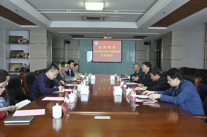 4月20日上午,河北师范大学汇华学院党委书记徐国强、副院长姚宏伟等一行七人来我校交流访问。贺阳集团副董事长臧卫东,我校党委书记刘更谦,副校长、党委副书记田沃,副校长马红亮热情接待了汇华学院来访客人一行。教务处、学工处、资产处、后勤处、招就办、公共课部等部门负责人参加了交流会。