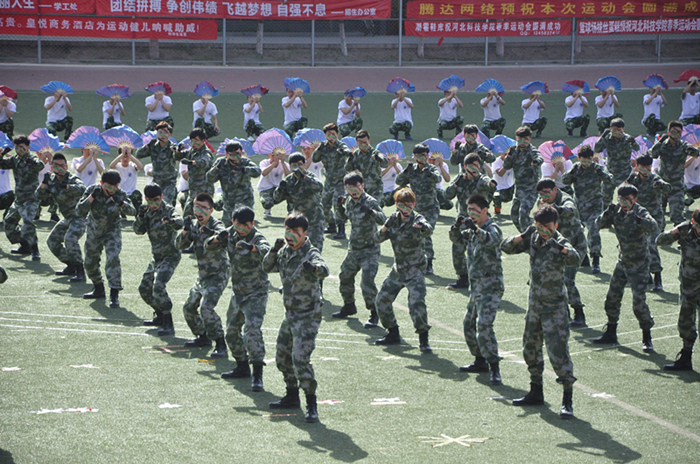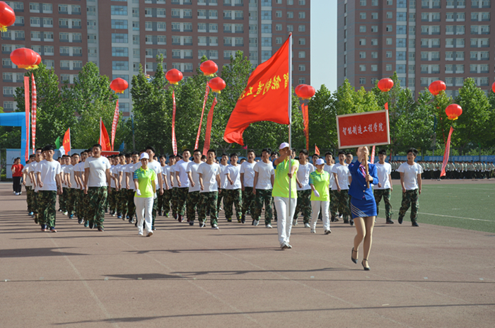 艺术学院的同学们在操场中央尽情的奔跑,形成流动的曲线,组成多幅美丽的图案,他们高举手中的花环,用心灵舞动青春的色彩,用热情照亮五月的天空,用灵动的身姿幻化成美丽的中国结。智能制造工程学院整齐庄严的预备役方队,一招制敌,拳腿合并,硬气功及一体化的武术表演,展现了我校实行准军事化管理的成果。建筑工程学院的同学们将新疆舞、西藏舞的特色表现的淋淋尽致,《美丽的神话》将中西方文化完美融合。汽车工程学院的同学们用彩花组成“車”、“忠”、“国”的字样,表达了汽车学子的理想信念,武术中的他们步伐稳健,站如松,坐如钟,行如风,拳如猛虎下山,横扫千军。经济管理学院羽扇飘飞、此起彼伏,河北科技首字母呈现眼前,彩旗飞扬,旗扇交辉,青春舞动,众志成城。