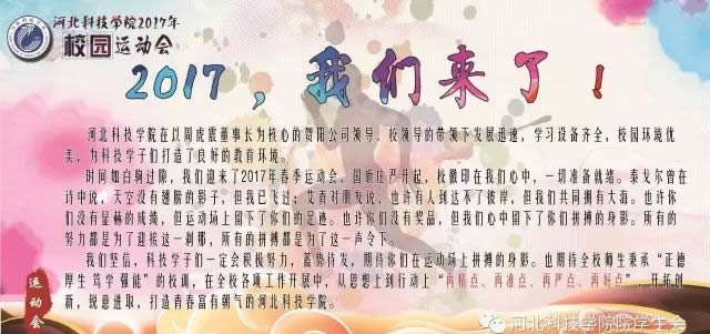 时间如白驹过隙,我们迎来了2017年春季运动会,国旗庄严升起,校徽印在我们心中,一切准备就绪。泰戈尔曾在诗中说,天空没有翅膀的影子,但我已飞过;艾青对朋友说,也许有人到达不了彼岸,但我们共同拥有大海。也许你们没有显赫的成绩,但运动场上留下了你们的足迹。也许你们没有奖品,但我们心中留下了你们拼搏的身影。所有的努力都是为了迎接这一刹那,所有的拼搏都是为了这一声令下。