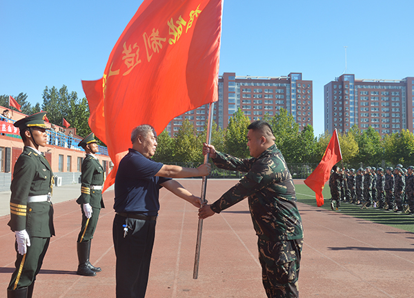 随后,国旗班副班长张硕作为教官代表发言。他表示,军训的意义在于磨炼意志,培养情操,增强国防意识、集体观念,继承发扬军人的优良革命传统。2019级孙姝涵同学作为新生代表发言,希望同学们通过此次军训塑造全新的自我,以坚韧不拔的精神面貌面对今后的挑战,展现当代大学生的独特风采,并代表全体同学们传达了能战胜困难、圆满完成军训任务的决心。校领导为军训各营授旗,各营代表接到营旗后,同学们高喊口号,士气十足。